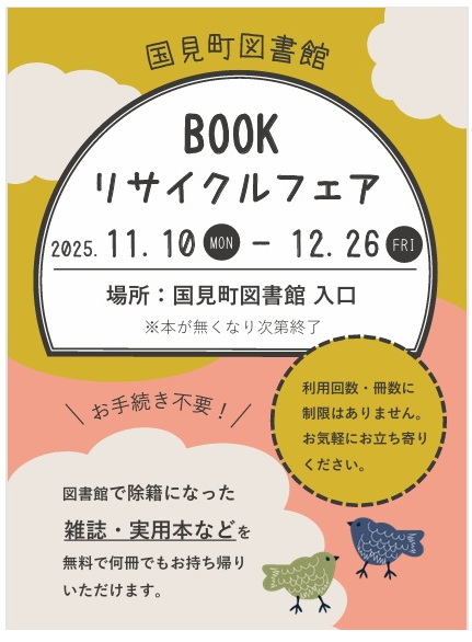国見町図書館入口に、当館で除籍となった雑誌や実用本、児童書を集めます。