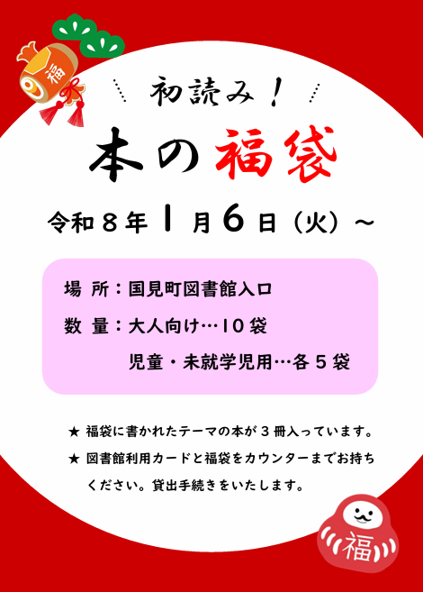 令和8年1月6日(火)から、図書館入口で新春企画「初読み福袋」の貸出をします!