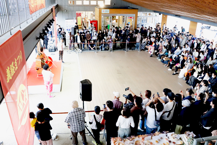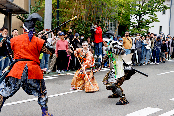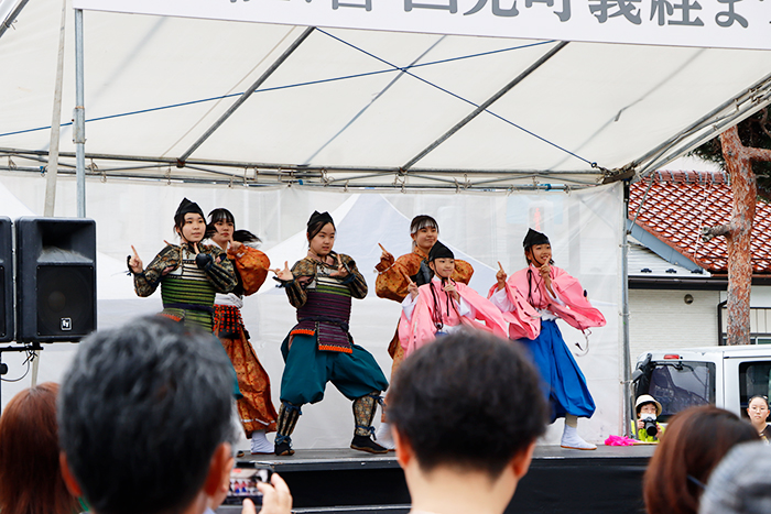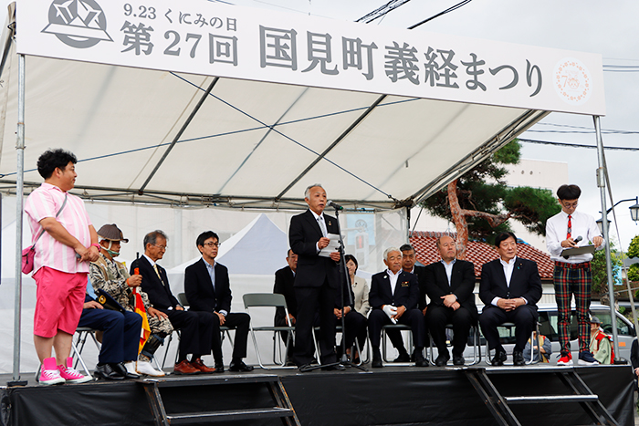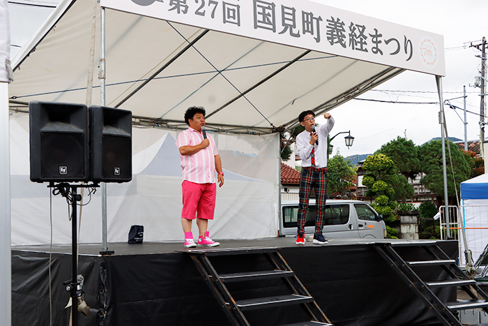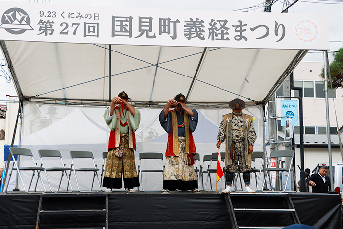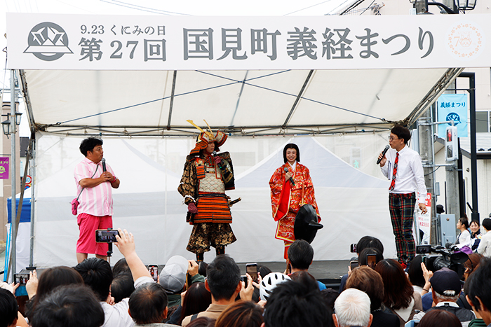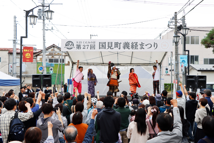 行列がステージに到着すると、義経と静御前によるトーク・ライブが行われ、閉祭式では安田副実行委員長による御礼のあいさつの後、義経公役で出演した磨田寛大さんの力強い勝どきで、第27回義経まつりが締めくくられました。