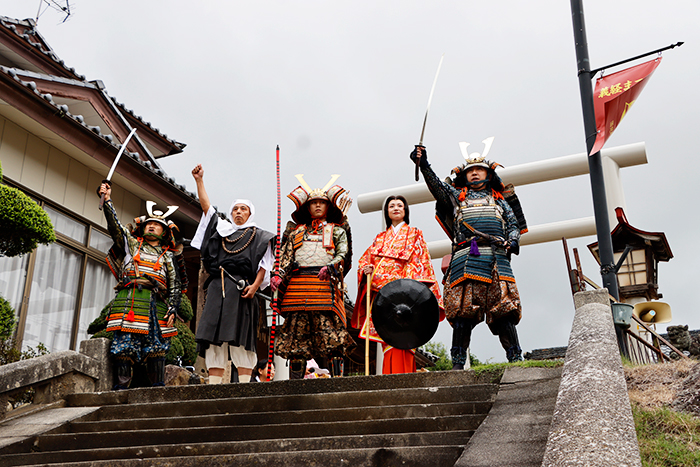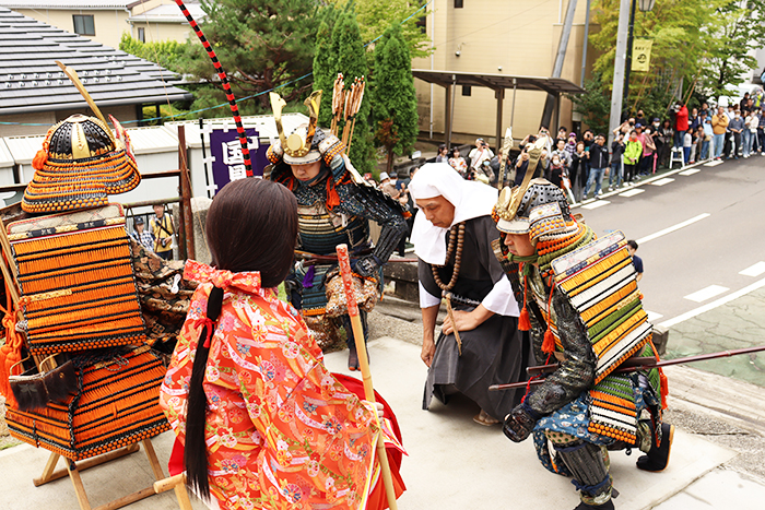 武蔵坊弁慶、佐藤継信・忠信が、軍勢を引き連れて源義経と静御前を鹿島神社にお迎えにあがり、継信の勝どきで行列が、道の駅国見あつかしの郷、そして商店街のメインステージに向かって出発しました。