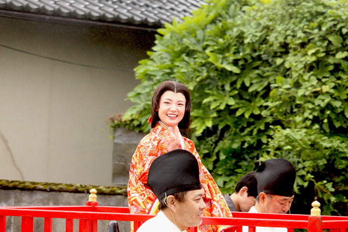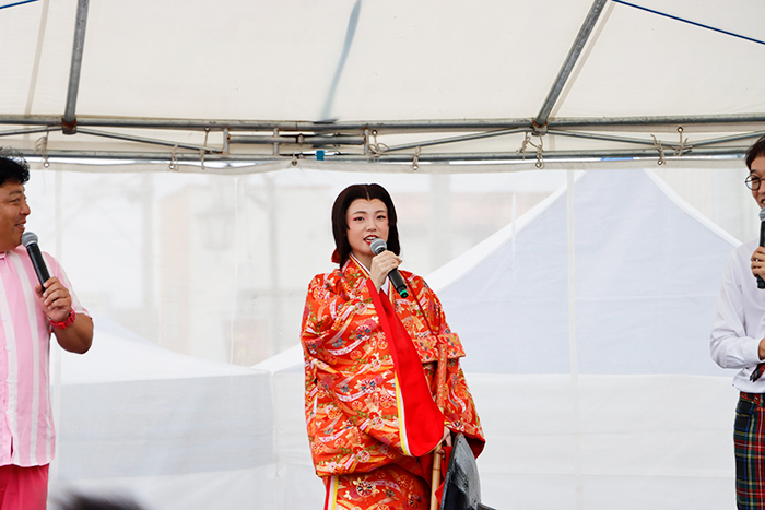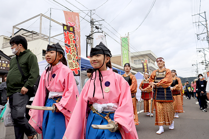 メインの義経公行列は、義経役としてダンスボーカルグループ「Seven Deuce」メンバーの磨田寛大さん、静御前役として福島美少女図鑑モデルの牧田優花さんが出演しました。