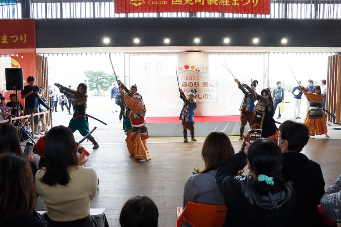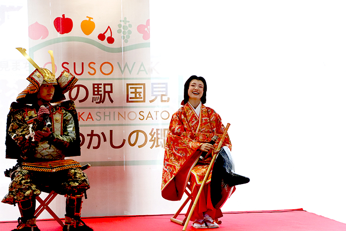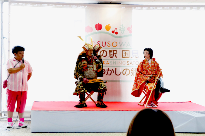 道の駅国見あつかしの郷の特設ステージでは、サムライアクションや、義経公たちによるトークショーが行われました。